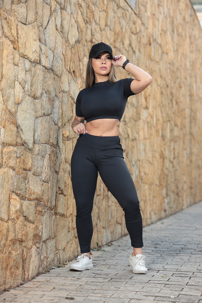 CJ46008 - Conj. Calça e Top Poliamida Canelado Manga Curta - Preto